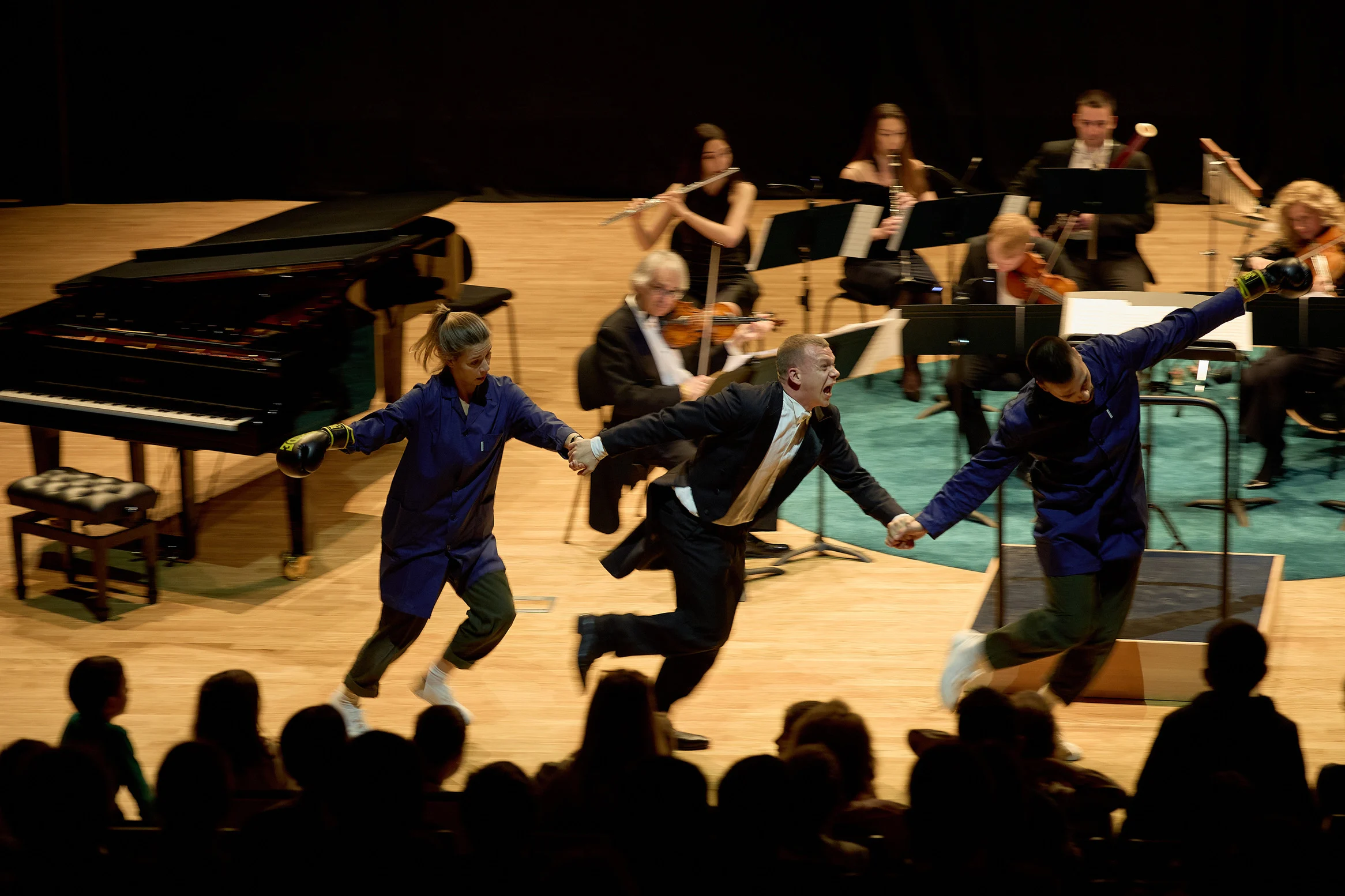‘Dvoje scenskih radnika nađe se, spletom okolnosti, usred koncerta. Taman su htjeli premjestiti neke instrumente, postaviti note i lampe na mjesta, malo se zanijeli u ‘kreveljenju’ i igri, kad im se dogodi situacija! Ulijeće orkestar, strogi dirigent i počinje koncert! Kreće vratolomna igra skrivanja, ‘glupiranja’, dirigiranja, sviranja, lova i bijega. A u pozadini Mozartova glazba…’, dio je opisa same koncert-predstave ‘Dirigenti’ u režiji Ivana Kristijana Majića te izvedbi glumaca: Silvija Švasta, Hane Schӧnfeld i Grgura Grgića te Krežminog ansambla glazbenika: Bele Nagyja i Vladimira Piskunova na violinama, Veronike Kilmajer na violi, Maje Iljovski na violončelu, Siniše Mazalice na kontrabasu, Mije Mandić na flauti, Žane Smojver na klarinetu, Domagaja Pećara na fagotu i Laszla Kolara na udaraljkama.