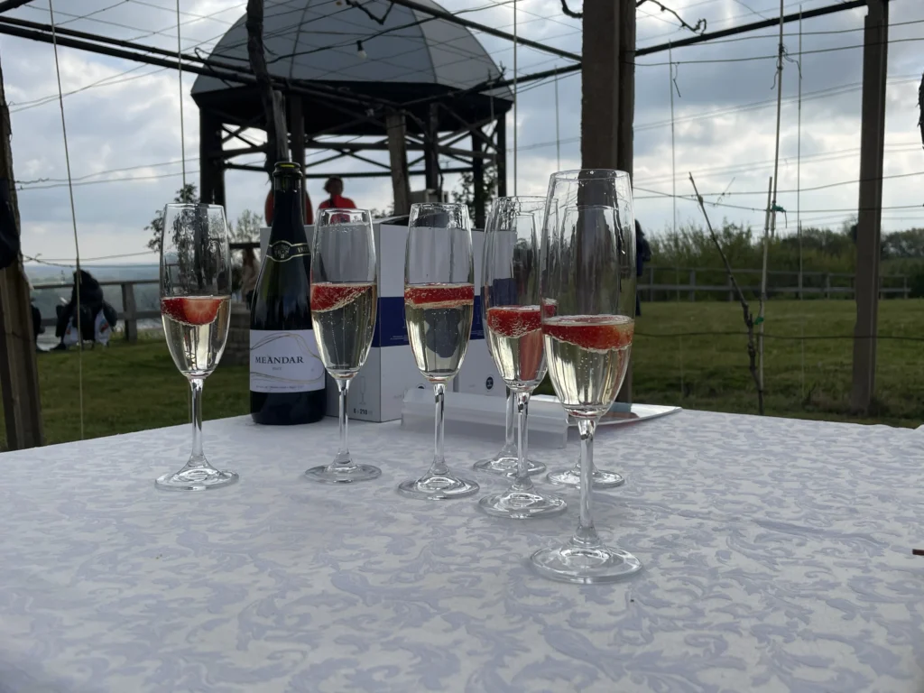 U tom ozračju rasta i sve većeg interesa, na Vidikovcu imanja Vina Erdut je započelo i ovogodišnje izdanje manifestacije, s rutom dugom 14 kilometara. Vidikovac je to subotnje jutro (11. travnja 2026.) imao onu tihu eleganciju proljeća: bijeli i bačvasti stolovi, pogled na Erdutsku kulu s jedne strane i široki Dunav s druge, prizor koji očarava svojom jednostavnom ljepotom. Uz pjenušac Vina Erdut Meandar brut s jagodom u čaši, ražnjiće od ribe i čips od šarana, sudionici su se pripremali za put koji je bio pred njima. Fotografiranje je krenulo odmah — od okvira za uspomenu u kutu Vidikovca, preko ograde prema Dunavu, pa sve do bala sijena.