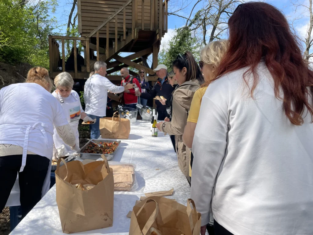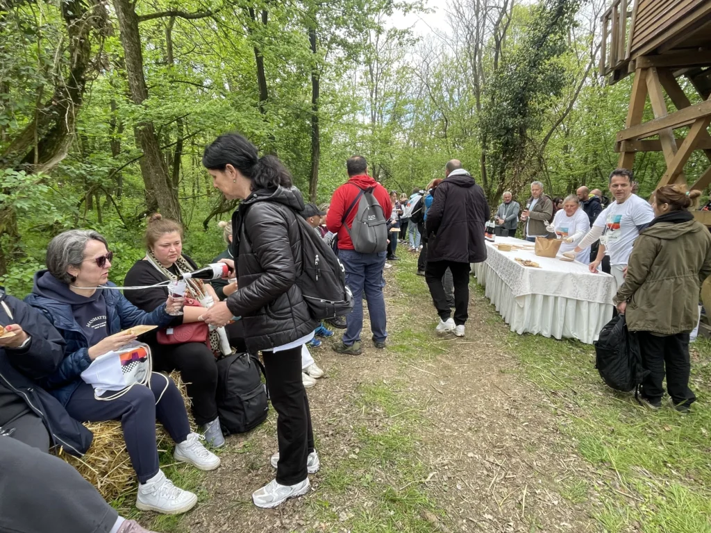 Na dva mjesta unutar šume čekali su punktovi s hranom: najprije pljeskavice, kobasice i ćevapi uz čašu Cuvée Noireaiz New Line kolekcije Vina Erdut, a potom puretina u umaku od gljiva s povrćem sa žara uz Graševinu iz iste New Line kolekcije. Nakon hrane i vina korak je postao mekši, razgovori glasniji, a ekipa opuštenija.