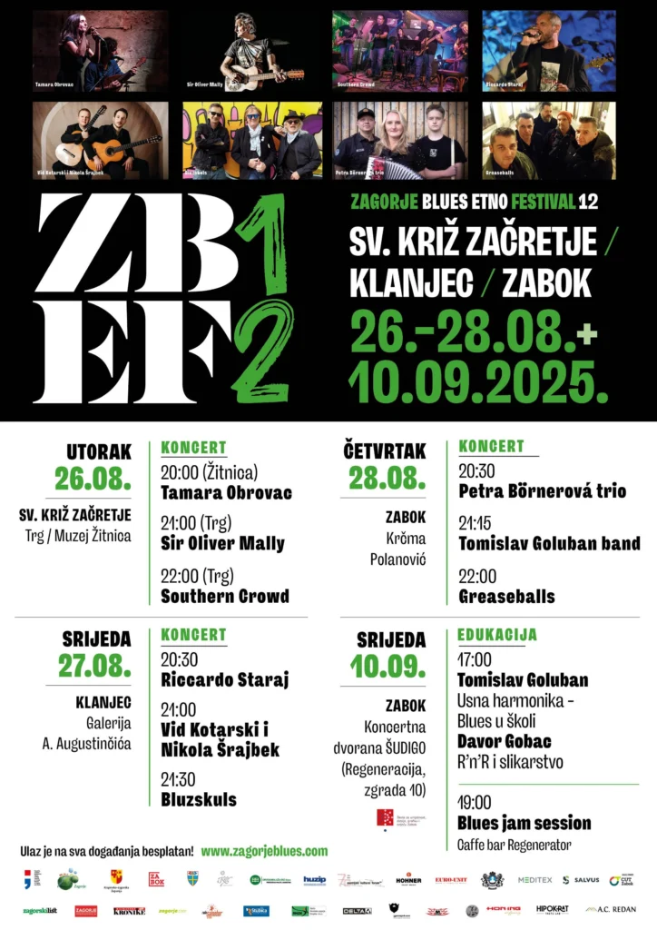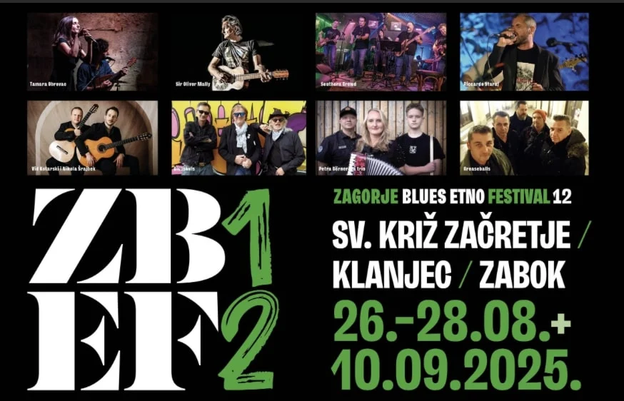 Zagorje ponovno svira u plavim tonovima — 12. izdanje Zagorje Blues Etno Festivala započinje u utorak, 26. kolovoza, i donosi trodnevni glazbeni program u Svetom Križu Začretju, Klanjcu i Zaboku, uz nastupe domaćih i inozemnih izvođača, te poseban edukativni segment s Davorom Gobcem i Tomislavom Golubanom.